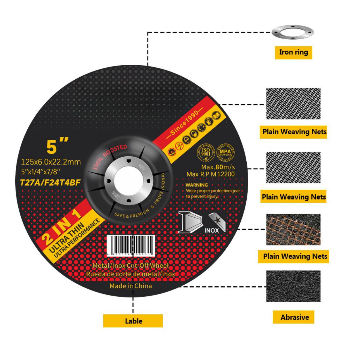 Là nhà sản xuất dụng cụ mài chuyên nghiệp, Qing Yang® cung cấp cho khách hàng công nghiệp toàn cầu Đá mài lưới kép đạt tiêu chuẩn EN12413. Sản phẩm cốt lõi T27 125mm sử dụng cấu trúc gia cố lưới sợi thủy tinh kép, với độ dày được kiểm soát chính xác ở mức 6,0mm±0,2mm, cân bằng hiệu suất cắt và dự phòng an toàn.